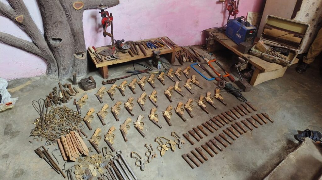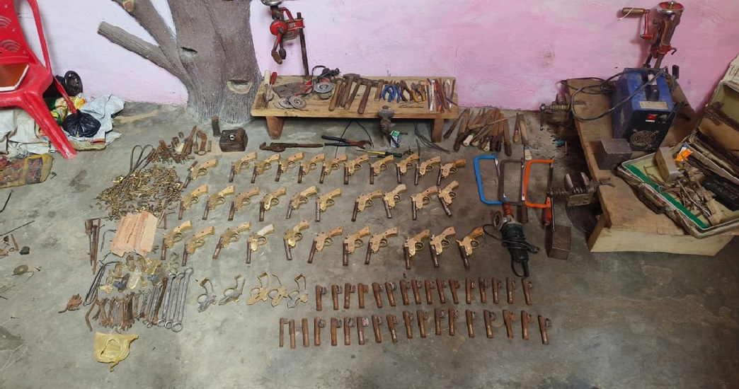 सात छोटे-बड़े प्लास, 12 छोटी-बड़ी आरी पत्ती, छह छोटी-बडी हथौड़ी, दो ग्राइन्डर मय ब्लेड, चार ग्राइन्डर ब्लेड, छह छोटे-बड़े पेचकस, 1 चिमटी स्टील, 6 छोटे-बडे स्प्रिंग,161 पीतल स्लाईडर व खटका, 5 हैमर पीतल के, 8 ट्रिगर पीतल के, 6 इजेक्टर पीतल के,तीन आरी लोहा मय ब्लेड, एक छोटी आरी मय ब्लेड, छह साइड लॉक पीतल के, दस लकड़ी की चाप, दो छैनी, दो खोखा कारतूस 315 बोर ,2 लोहे के बारीक छोटे- बड़े तारों को बण्डल और दो मोबाइल फोन कीपैड, एक स्मार्टफोन बरामद हुआ है।