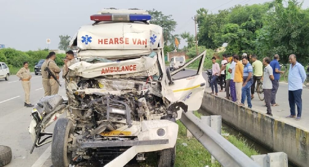 टक्कर में एंबुलेंस के परखच्चे उड़े