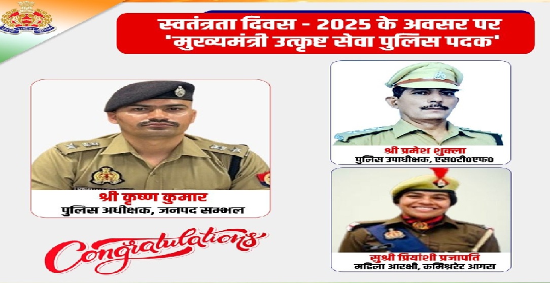 एसएमयूपीन्यूज, लखनऊ ।उत्तर प्रदेश सरकार ने स्वतंत्रता दिवस के अवसर पर उत्कृष्ट कार्यों के लिए तीन पुलिस अधिकारियों को मुख्यमंत्री का उत्कृष्ट सेवा पदक प्रदान किया है। संभल के पुलिस अधीक्षक कृष्ण कुमार विश्नोई, एसटीएफ के डिप्टी एसपी प्रमेश शुक्ला और आगरा पुलिस कमिश्नरेट की महिला आरक्षी प्रियांशी प्रजापति को यह सम्मान मिला है।