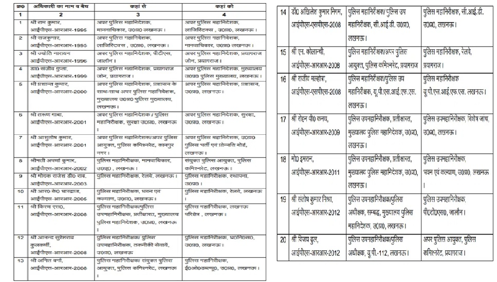 तबादलों की इस सूची में अपर पुलिस महानिदेशक स्तर से लेकर पुलिस उपमहानिरीक्षक स्तर तक के अधिकारी शामिल हैं। एडीजी मानवाधिकार राम कुमार को लॉजिस्टिक्स का अपर पुलिस महानिदेशक बनाया गया है, जबकि राजकुमार को लॉजिस्टिक्स से हटाकर मानवाधिकार की जिम्मेदारी दी गई है।प्रयागराज जोन में भी बड़ा बदलाव हुआ है। एडीजी पीटीएस जालौन ज्योति नारायण को प्रयागराज जोन का अपर पुलिस महानिदेशक बनाया गया है, जबकि वहां तैनात संजीव गुप्ता को पुलिस मुख्यालय लखनऊ भेजा गया है।