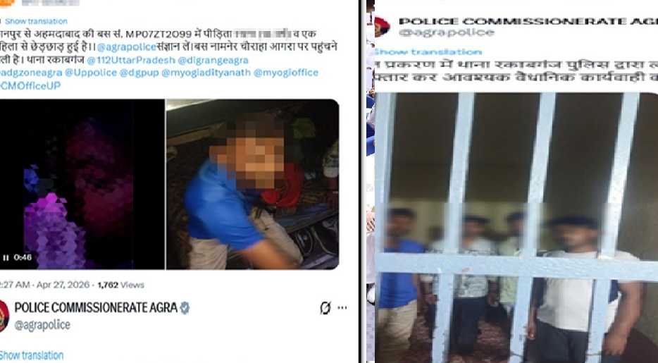 लखनऊ । यूपी के आगरा में महिला सुरक्षा को लेकर पुलिस की त्वरित कार्रवाई का बड़ा उदाहरण सामने आया है। सोशल मीडिया पर मिली सूचना के आधार पर कमिश्नरेट पुलिस ने महज 8 मिनट के भीतर चलती बस में छेड़छाड़ कर रहे चार आरोपियों को गिरफ्तार कर लिया।घटना 27 अप्रैल 2026 की देर रात करीब 12:27 बजे की है, जब सोशल मीडिया प्लेटफॉर्म ‘एक्स’ पर सूचना मिली कि कानपुर से अहमदाबाद जा रही एक बस (नंबर MP07ZT2099) में सवार कुछ युवक एक युवती और एक महिला के साथ अभद्रता कर रहे हैं। बस आगरा के नामनेर चौराहे की ओर बढ़ रही थी।